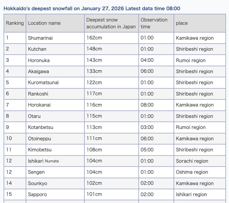 Kutchan Town, home to Niseko Hanazono Resort, recorded the second-deepest snow depth in Hokkaido as of January 27.