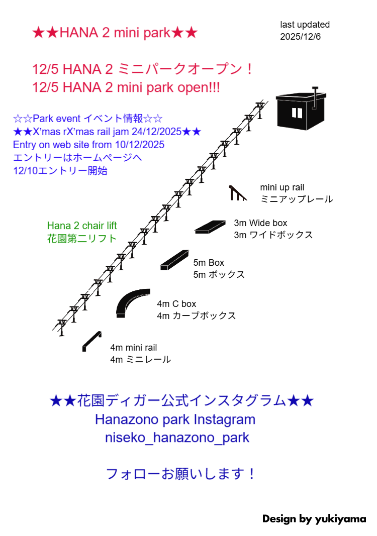 Main park for intermediate and advanced riders, which can be accessed by the cutting-edge 6-seater Hana 1 lif. For beginner and intermediate riders, there is a gondola park on the Hanazono Symphony Gondola side that is also open for night skiing. Don't forget to get used to the items in the Hana 2 mini park at the beginning of the season.