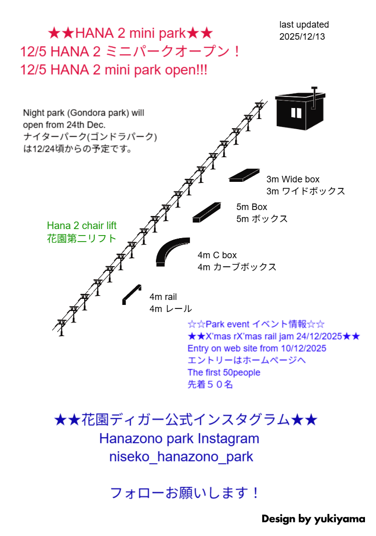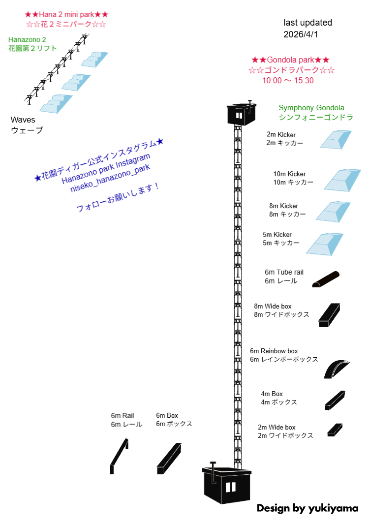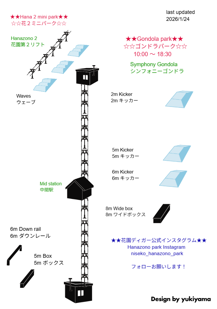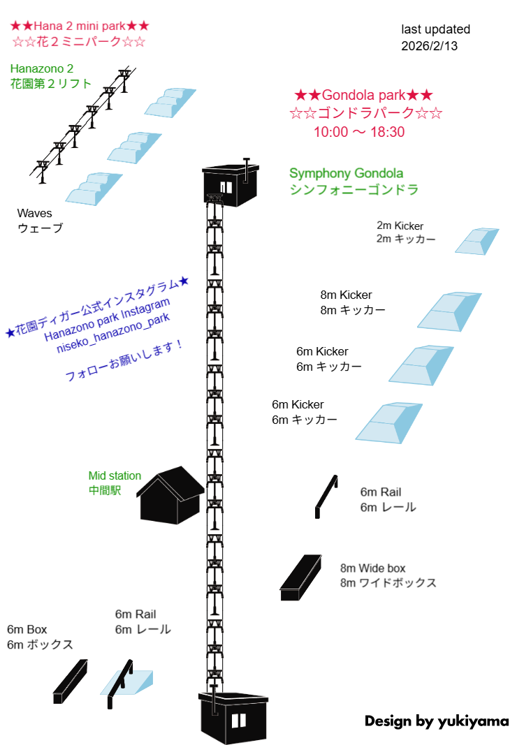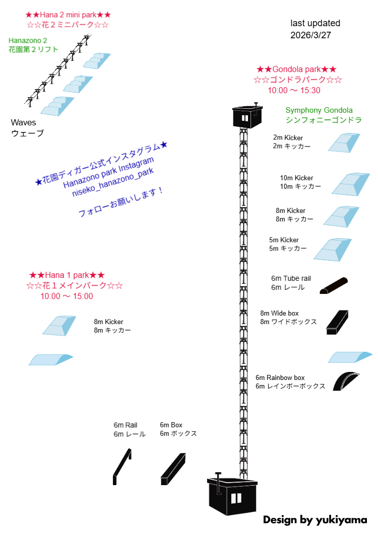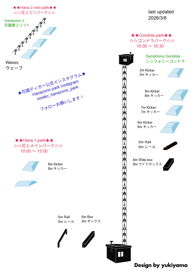 最新鋭の6人乗りHANAZONO第1リフトで流せる中上級者向けメインパークです。初中級者向けにはHANAZONOシンフォニーゴンドラ側にナイターでも遊べるゴンドラパークを営業します。シーズン初めはHANA2ミニパークで足慣らしもお忘れなく。